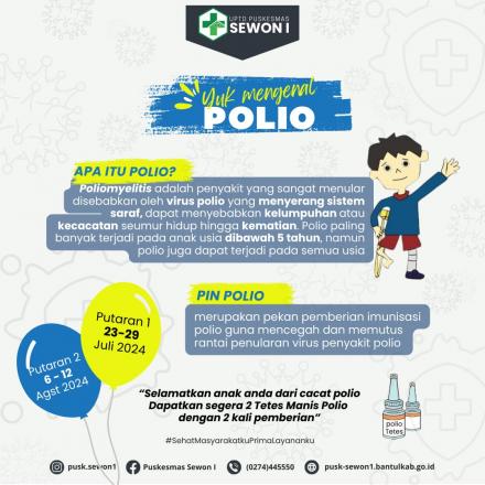 Mari sukseskan pin polio karena kecacatan akibat polio tidak dapat diobati namun dapat dicegah dengan pemberian imunisasi.