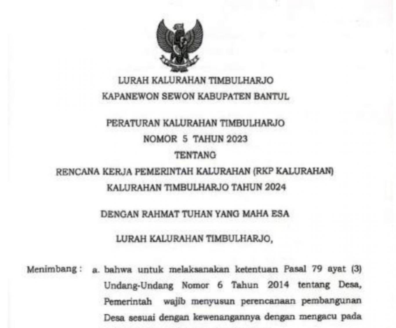 Peraturan Kalurahan Timbulharjo Nomor 3 Tahun 2024 tentang Rencana Kegiatan Pemerintah Kalurahan (RK