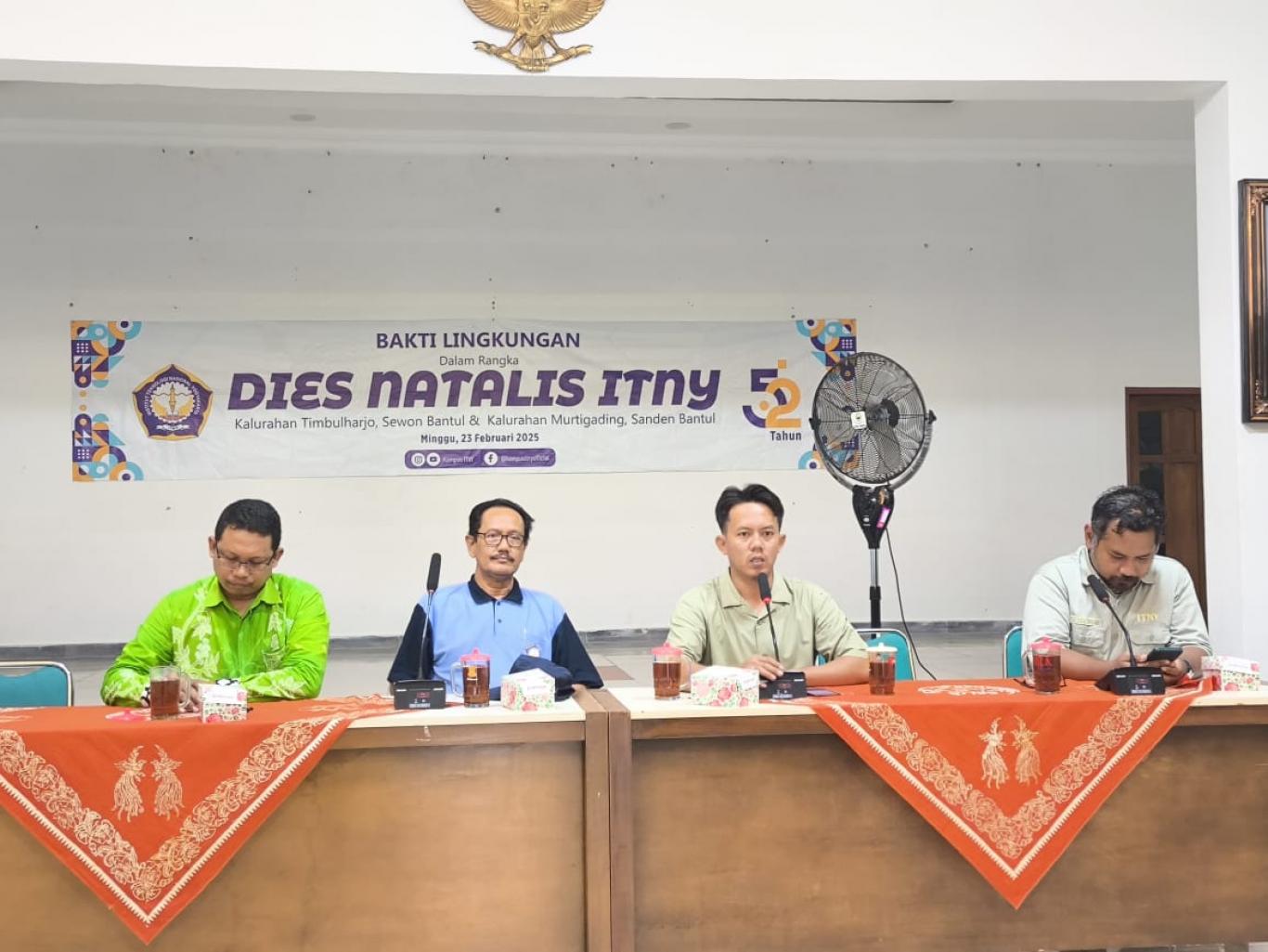 Timbul Warta (25/02/2025) Dalam rangka memperingati Dies Natalis ITNY ke 52, Kampus Institut Teknologi Nasional Yogyakarta mengadakan Bakti Lingkungan di Kalurahan Timbulharjo, Kapanewon Sewon, Kabupaten Bantul. Adapun kegiatan bakti lingkungan yang dilaksanakan yaitu penyerahan serta penanaman pohon di sekitar Kalurahan Timbulharjo. Acara bakti lingkungan yang diselenggarakan di Aula Kalurahan Timbulharjo diikuti oleh Rektor ITNY beserta jajaran dosen dan pegawai ITNY, FKPDAS DIY, dan Pamong Kalurahan Timbulharjo.
