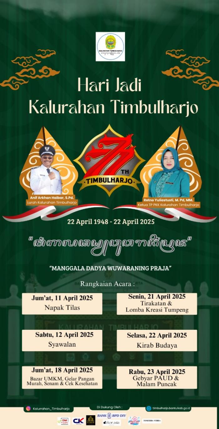 Peringatan Hari Jadi Kalurahan Timbulharjo yang ke 77 diselenggarakan dengan beberapa serangkaian kegiatan sebagai berikut: